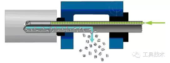 槍鉆(見圖1)的鉆柄是空的,由內(nèi)外部供應(yīng)的切削液流經(jīng)鉆頭內(nèi)輸送管,并強行流經(jīng)切削頭內(nèi)的孔。鉆柄外側(cè)有一個沿著長度方向的V形槽,切削液攜帶切屑通過此V形槽,并經(jīng)過鉆頭外側(cè),最終切屑從孔中排出。槍鉆可應(yīng)用于普通加工中心,但是需要高壓力的切削液。