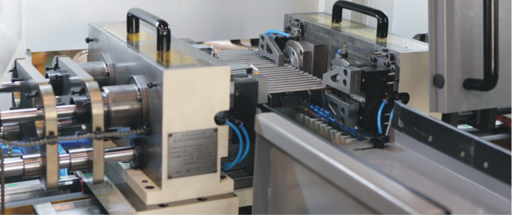該機(jī)床采用四軸對(duì)進(jìn)式加工,進(jìn)口氣動(dòng)自定心求心夾具裝夾,通過一次安裝即可完成高精度臺(tái)階孔的加工,并具備極高的入口位置精度。機(jī)床自動(dòng)上料機(jī)構(gòu)單次最大安裝工件數(shù)量為22只,極大縮減了機(jī)床加工的輔助時(shí)間,效率極高。其一個(gè)加工循環(huán)的時(shí)間跨度合理,便于工廠進(jìn)行人員及生產(chǎn)安排,并大幅降低了工人勞動(dòng)強(qiáng)度。